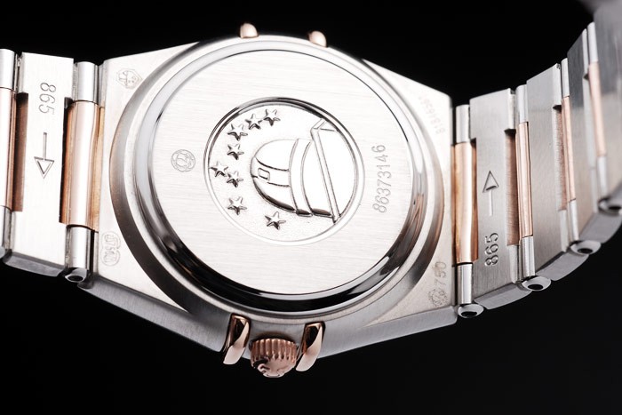 Back: Brushed stainless steel push-in back with engravings Gender: DonneMovement: Quarzo (Batteria) Quality: Svizzera ETA Case: Brushed stainless steel case Bracelet: Brushed stainless steel and rose-gold link chain bracelet with hidden clasp and Omega Replica logo on top Bracelet Length: 160 x 16 mm Bezel: Diamond studded rose-gold bezel Band Type: Acciaio inossidabile Diameter: 26 x 25 mm Watch Clasp: Flip Clasp Glass: Sapphire Crystal Crown: 18k rose-gold cutwork crown with Omega Replica logo Case Thickness: 8 mm