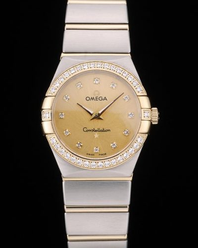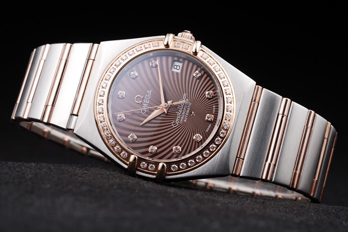 Back: Brushed stainless steel push-in back with engravings Gender: UominiMovement: Quarzo (Batteria) Quality: Svizzera ETA Case: Brushed stainless steel case Bracelet: Brushed stainless steel and rose-gold link chain bracelet with hidden clasp and Omega Replica logo on top Bracelet Length: 180 x 22 mm Bezel: Diamond studded rose-gold bezel Band Type: Acciaio inossidabile Diameter: 37 x 34 mm Watch Clasp: Flip Clasp Glass: Sapphire Crystal Crown: 18k rose-gold cutwork crown with Omega Replica logo Case Thickness: 11 mm