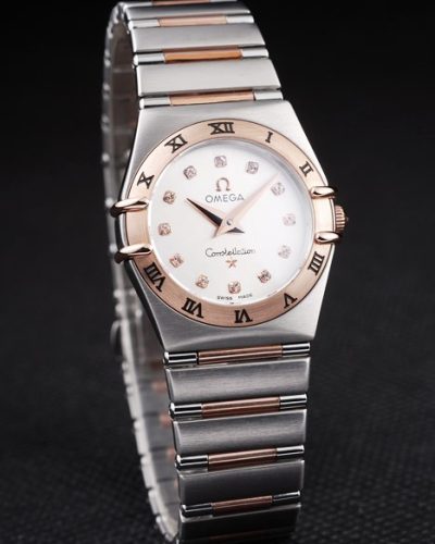 Back: Brushed stainless steel push-in back with engravings Gender: UominiMovement: Quarzo (Batteria) Quality: Svizzera ETA Case: Brushed stainless steel case Bracelet: Brushed stainless steel and rose-gold link chain bracelet with hidden clasp and Omega Replica logo on top Bracelet Length: 180 x 22 mm Bezel: Diamond studded rose-gold bezel Band Type: Acciaio inossidabile Diameter: 37 x 34 mm Watch Clasp: Flip Clasp Glass: Sapphire Crystal Crown: 18k rose-gold cutwork crown with Omega Replica logo Case Thickness: 11 mm