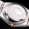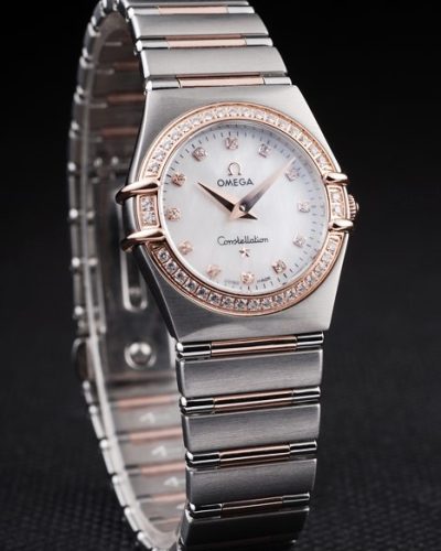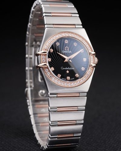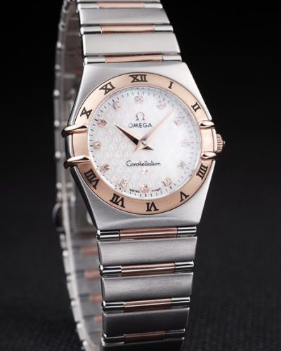 Back: Brushed stainless steel push-in back with engravings Gender: UominiMovement: Quarzo (Batteria) Quality: Svizzera ETA Case: Brushed stainless steel case Bracelet: Brushed stainless steel and rose-gold link chain bracelet with hidden clasp and Omega Replica logo on top Bracelet Length: 180 x 22 mm Bezel: Rose-gold bezel with black Roman number hour markers Band Type: Acciaio inossidabile Diameter: 37 x 34 mm Watch Clasp: Flip Clasp Glass: Sapphire Crystal Crown: 18k rose-gold cutwork crown with Omega Replica logo Case Thickness: 11 mm