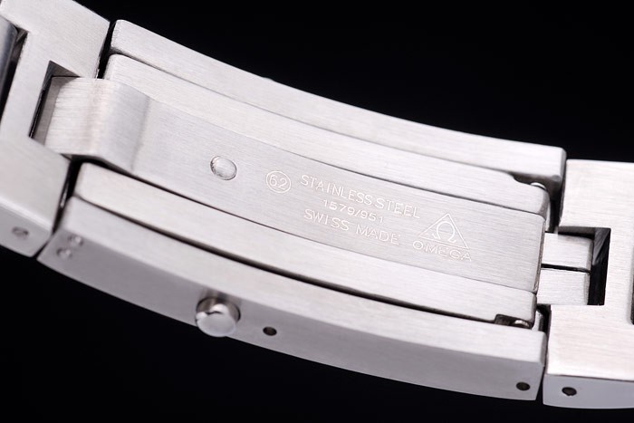 Crown: Polished stainless steel cutwork crown with Omega Replica logo plus another similar crown on the opposite top corner