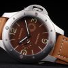 Back: Screwed down stainless steel back with Officine Panerai Replica Firenze engraving Gender: UominiMovement: Cinetico (Automatico) con carica manuale quotidiana Quality: Giapponese Miyota Color: Marrone Case: Brushed stainless steel case Bracelet: Light brown leather strap with heat embossed Officine Panerai Replica Italy stamp and brushed stainless steel hook-buckle clasp with Panerai Replica engraving Bracelet Length: 227 x 24 mm Bezel: Brushed stainless steel bezel with standout minute markers and every quarter marked in red Arabic numerals Band Type: Pelle Diameter: 67 x 54 mm Watch Clasp: Buckle Glass: Sapphire Crystal Crown: Brushed stainless steel cutwork crown enclosed within an arched protection Case Thickness: 17 mm