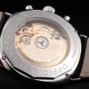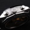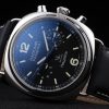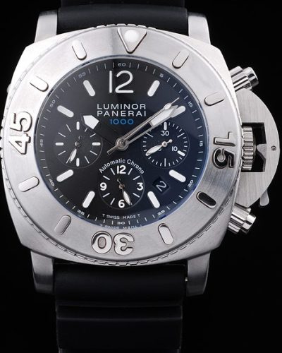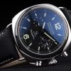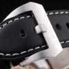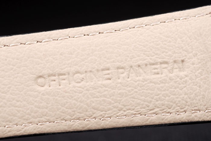 Bracelet: Black leather strap with white stitching and heat embossed Officine Panerai Replica Italy stamp and brushed stainless steel hook-buckle clasp with Panerai Replica engraving