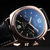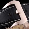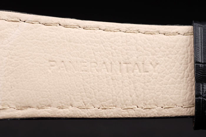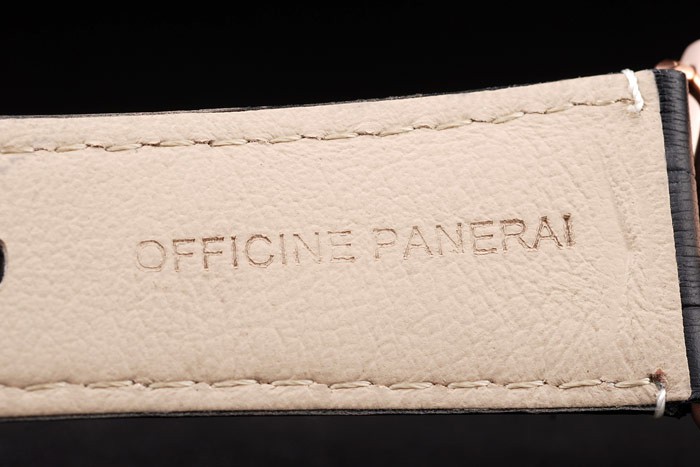 Bracelet: Black crocodile leather strap with white stitching and heat embossed Officine Panerai Replica Italy stamp and 18k rose-gold plated hook-buckle clasp with Panerai Replica engraving