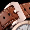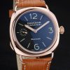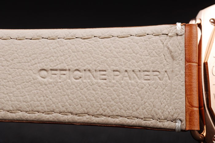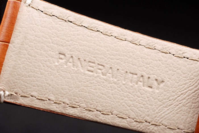 Bracelet: Brown crocodile leather strap with white stitching and heat embossed Officine Panerai Replica Italy stamp and 18k rose-gold plated hook-buckle clasp with Panerai Replica engraving