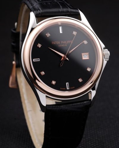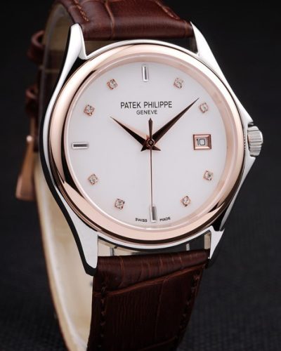 Bracelet: Brown leather strap with Patek Philippe Replica stamp and a rose gold fold in clasp and a Patek logo buckle
