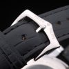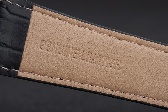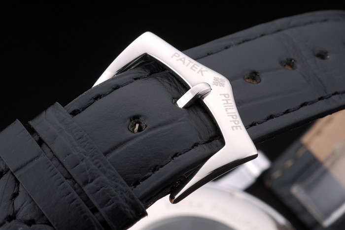 Bracelet: Black crocodile leather strap with heat embossed Patek Philippe Replica stamp and polished stainless steel hook-buckle clasp with Patek Philippe Replica engraving