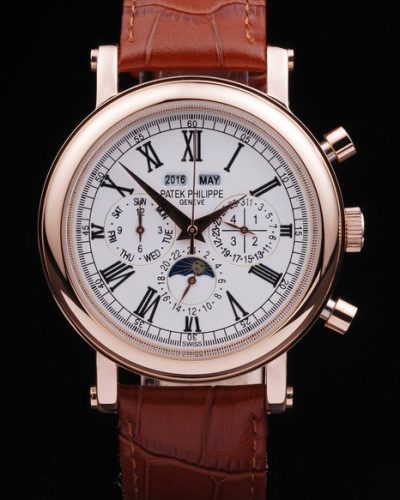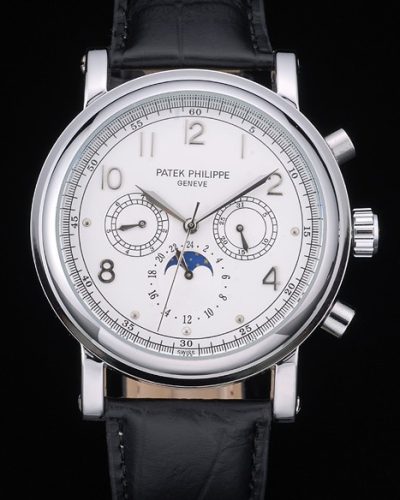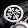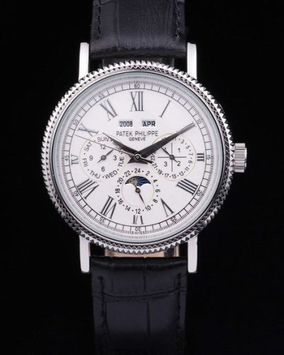 Bracelet: Black crocodile leather strap with heat embossed Patek Philippe Replica stamp and polished stainless steel Patek Philippe Replica logo hook-buckle clasp