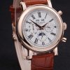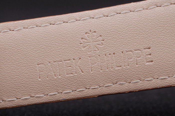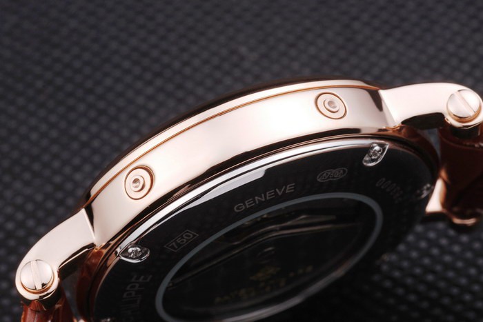 Bracelet: Brown leather strap with Patek Philippe Replica stamp and a rose gold fold in clasp