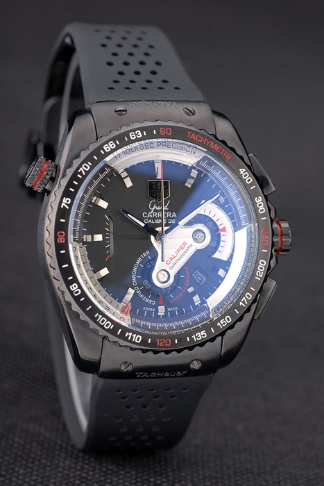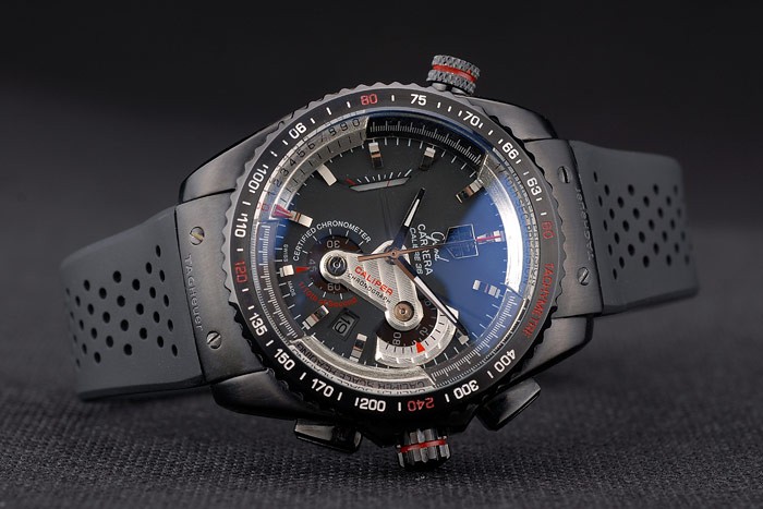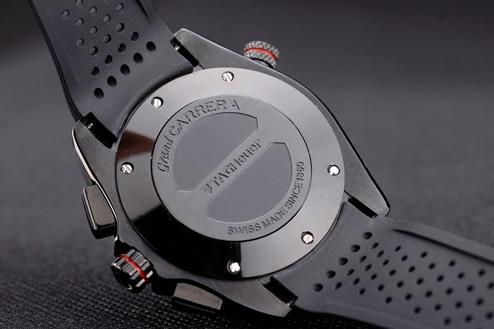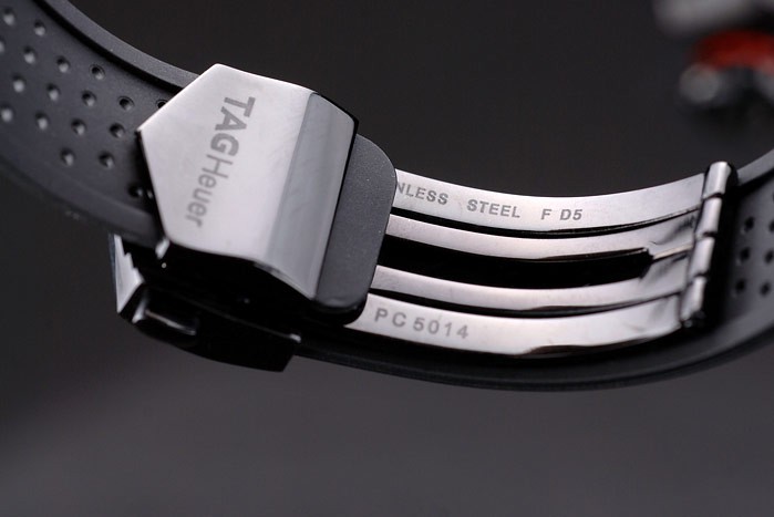 Bracelet: Perforated black rubber strap with Tag Heuer Replica engraved ion-plated fold-in clasp with push release feature