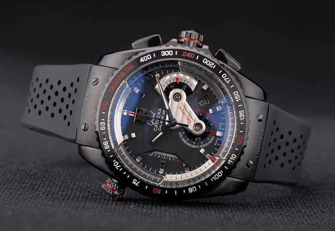 Crown: Ion-plated cutwork crown with red band and Tag Heuer Replica logo and two long cutwork push button crowns on either side of it along with a cutwork crown on the opposite side