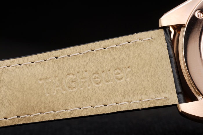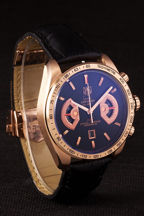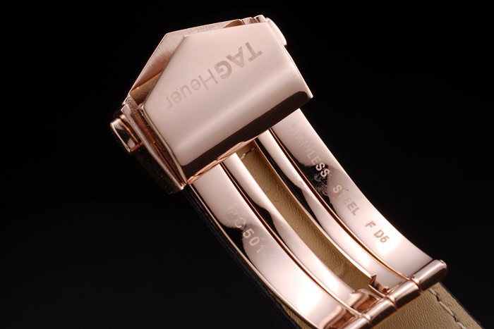 Back: Rose-gold plated screwed down back with Tag Heuer Replica Carrera engravings Gender: UominiMovement: Quarzo (Batteria) Quality: Giapponese Miyota Color: Nero Case: 18k rose-gold plated case Bracelet: Heat embossed Tag Heuer Replica black crocodile leather strap with rose-gold push-release fold over clasp with Tag Heuer Replica logo on top Bracelet Length: 205 x 22 mm Bezel: Rose-gold plated bezel with tachymeter Band Type: Pelle di coccodrillo Diameter: 50 x 43 mm Chronograph: Si Glass: Sapphire Crystal Crown: Rose-gold plated cutwork crown with Tag Heuer Replica logo and red band trim and two smaller cutwork crowns on either side of it Case Thickness: 15 mm