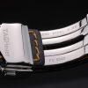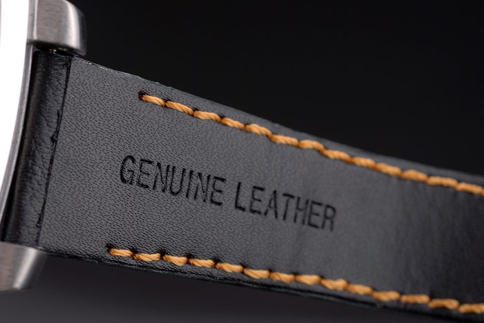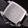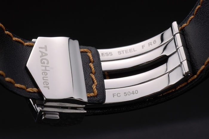 Bracelet: Heat embossed Tag Heuer Replica black perforated leather strap with orange stitching in the inside and stainless steel fold-in clasp with push release feature
