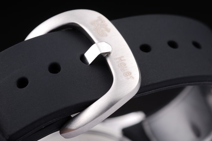 Bracelet: Black rubber strap with brushed stainless steel hook-buckle clasp with Tag Heuer Replica inscription