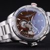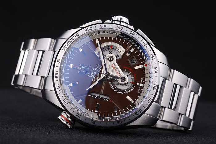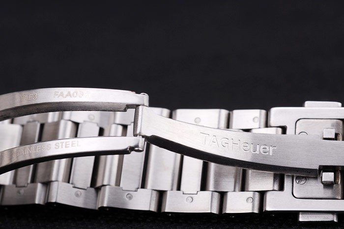 Crown: Polished stainless steel cutwork crown with black enamel Tag Heuer Replica logo and two long cutwork push-button crowns on either side of it plus another crown on the opposite top corner