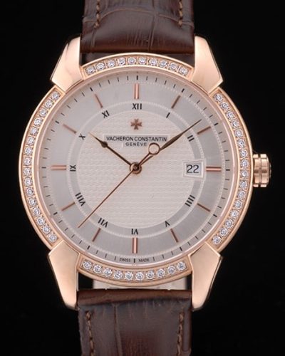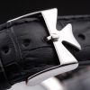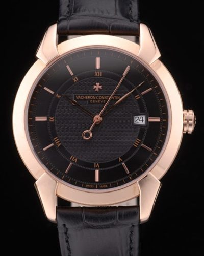 Bracelet: Black crocodile leather strap with heat embossed Vacheron Constantin Replica stamp and polished stainless steel Vacheron Constantin Replica logo hook-buckle clasp